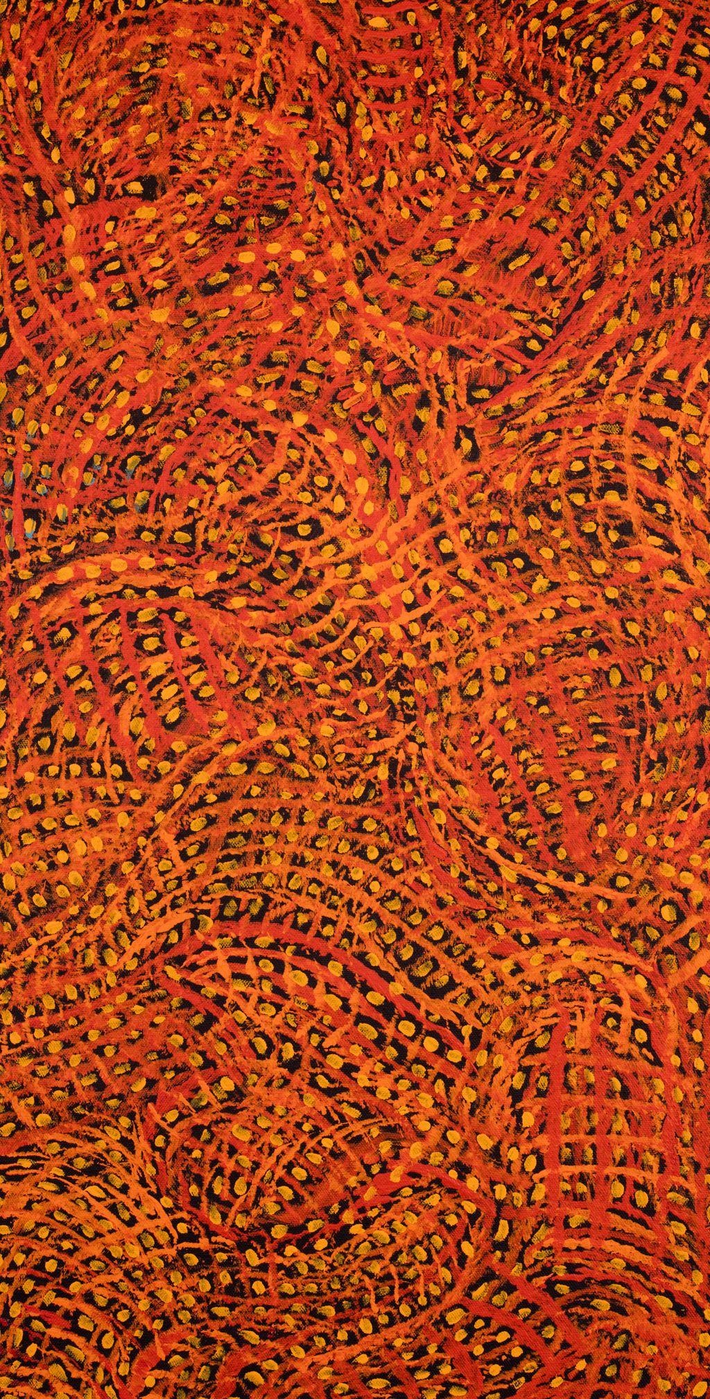 In this painting I have depicted the pods of a shrub which is common in the Pilbara area. It is a smallish bush which comes into seed in September, when the Emu is visible in the Milky Way. This is the time the emu chicks hatch and it is one of their main sources of food. When the pod opens the parent emus feed the little black seeds to their chicks. The seed pod, which is about the size and the shape of a cockroach, turns from orange to yellow, so when all the bushes are in pod at different stages, there is a brilliant display of orange and yellow colours throughout the country. The official name of this annual shrub is Senna notabilis, but, due to the oblong, flat shape and the glossy golden brown colour of its pods, it is known commonly as Cockroach Bush. It has a little round fruit, a berry, that starts of green and turns red when it is ripe, but it’s poisonous. The shrub starts off as a light green colour and then, as it matures, it gets darker. The flowers are a yellowy orange and they, too, get darker with a bit of black as they are fading away.