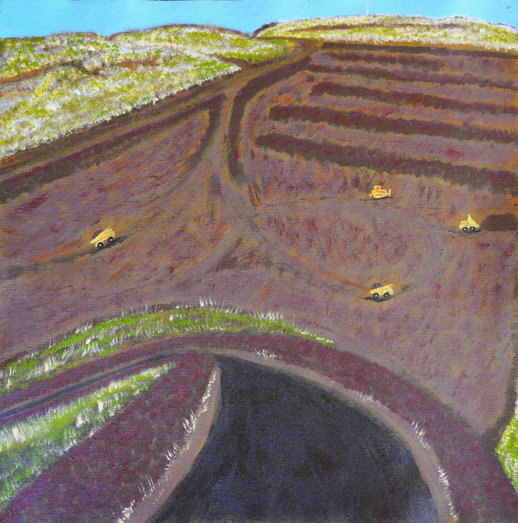 King’s pit is in Soloman Mine in Yindjibarndi Country. This painting here is the process of rehabilitating after all the iron ore has been mined. On the top right you can see the stockpiles of dirt they are bringing back to the deep areas so they can try and put the pit back to the way it was when they came. That background hill with the little line on the right top corner is the communication tower and from that hill you can see Wittenoom.