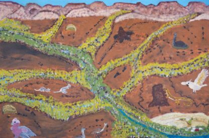 My grandparents grew up and worked for the stations; Millstream, Kangagie, Tambery, Mount Florance, Mulgu Downs. This painting is of the Fortescue River from where the Rainbow Serpant lives now. Millstream goes up toward and alongside of ranges and other mobs in the Pilbara use this river for guidance and travelling through the Country. All the other rivers that feed into the Fortescue are used for hunting, gathering and teaching while people travel up and downs station to station. The animals in the painting represent and connect us. Sometimes animals communicate somebody coming, good or bad luck or if you’re welcome or not. We also use animals for medicine such as the Emu and Goanna for oil. Animals are also interwoven to our songline. Each of these animals have connection to us and our Lore Country.