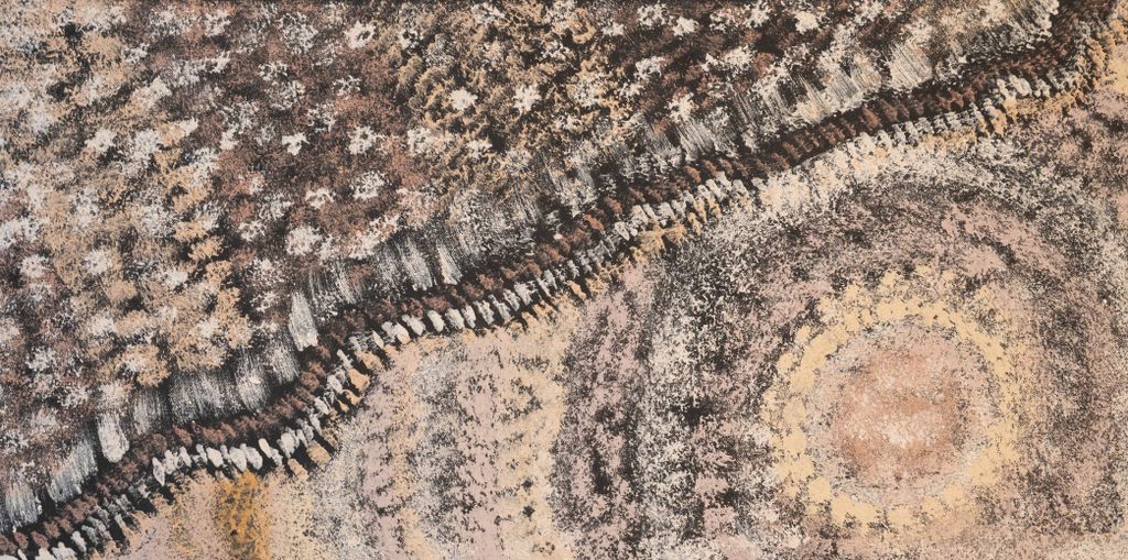 Emily is one of Yinjaa-Barni Art’s emerging artists. Emily painted this artwork after returning to Country on an art centre camp to Millstream. She collected natural pigments from Millstream crossing and ground the rock down to natural pigment using a flat rock as a surface and a round rock as a tool. This is Emily’s first foray into painting with natural pigments. The artwork represents people gathering from the Country going to the waterhole.