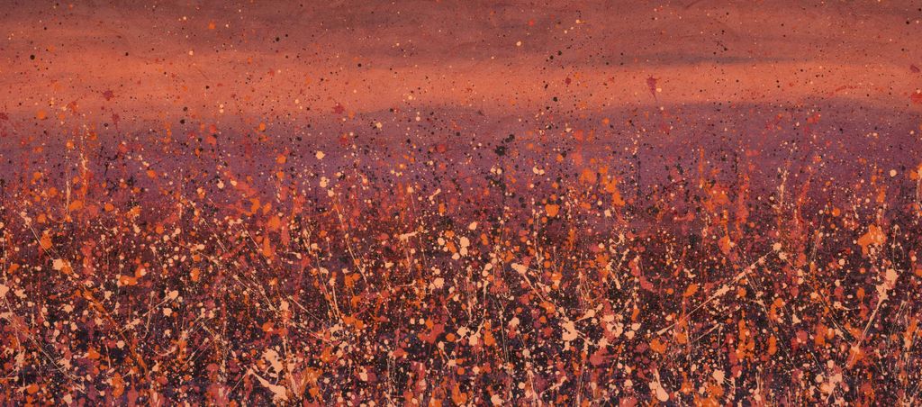 In the last light of the day, the wildflowers and Country take on new colours. In the earth you can see glimmers of darker copper colours and deep burgundy as the last light of the day hits the Pilbara. The pinks represent the mulla mulla flowers and the desert sturt pea has changed from bright red to a subtle bronze red.